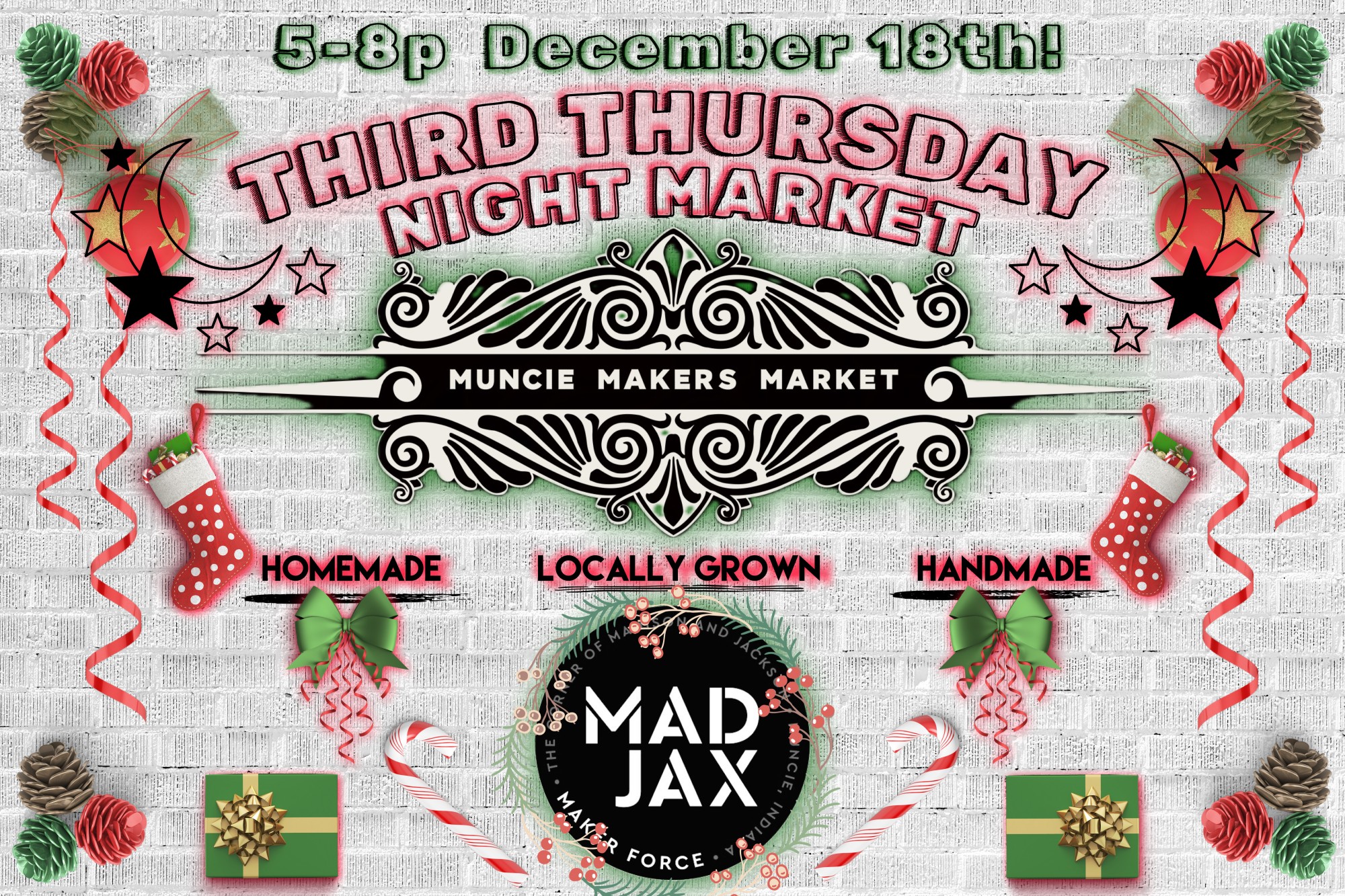 It's our first Holiday Night Market! 🎁 Come shop with our Hoosier Artisans in a fun and festive environment and check out all that’s happening with the Muncie Makers Market and MadJax on Third Thursday this month: